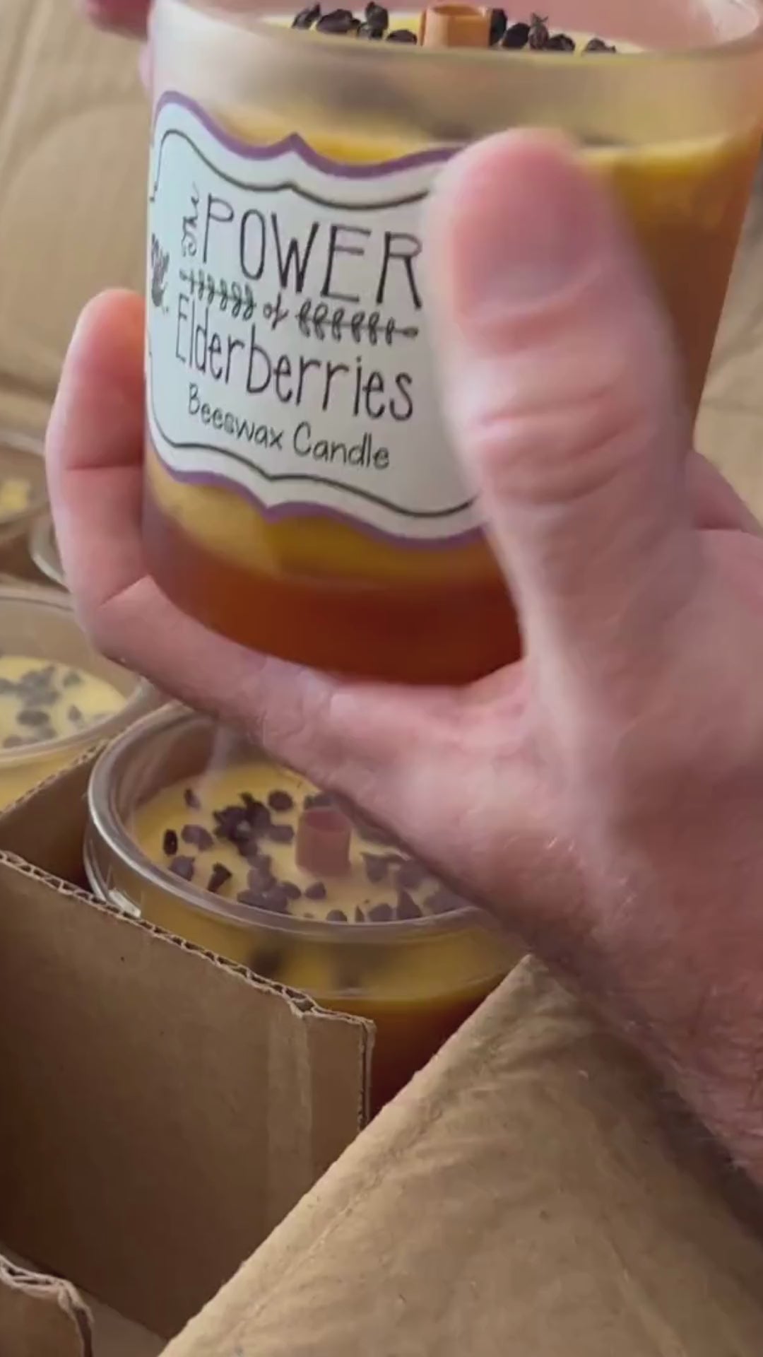 Our handcrafted Elderberry Beeswax Candle is made with pure beeswax, organic coconut oil, and a wooden wick, then scented with essential oils inspired by our signature elderberry syrup (elderberry, ginger, cinnamon, and clove). The result is a clean, soothing fragrance that’s lighter and more natural than commercial candles—because we never use harsh synthetic fragrances.